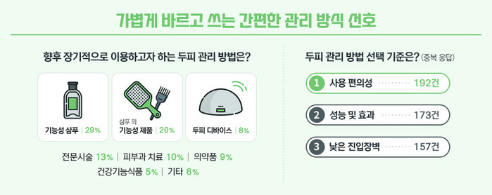 관리 시 접근성이 주요 고려 요소인 것으로 나타났다. 향후 두피 관리 방식 선택 기준을 묻는 질문(중복 응답)에 48%가 사용 편의성을 꼽았으며, 낮은 진입 장벽을 언급한 이들도 39.3%에 달했다. 성능 및 효과(43.3%)에 대한 기대 또한 높았다. 가장 선호하는 관리 방식으로 기능성 샴푸(29%)와 헤어 제품(20%)이 높은 순위에 오른 배경이다. 다만, 여성 소비자의 경우 전문 시술(17.5%)이나 두피 디바이스(10%)에도 관심을 보이고 있는 것으로 조사됐다.