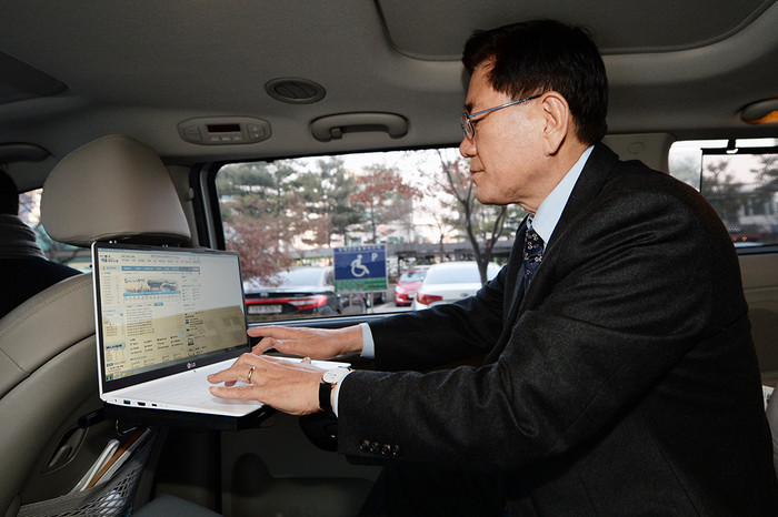 | ▲유덕열 동대문구청장이 외부 출장 중 차량에서 ‘정부원격근무서비스’를 이용해 결재를 하고 있다.(동대문구 제공) |