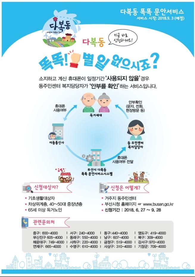 [로컬세계 맹화찬 기자]부산시는 9월 3일부터 휴대전화 통화기록 상태를 분석해 안부를 확인하는 ‘다복동 똑똑 문안 서비스’를 시작한다고 밝혔다.