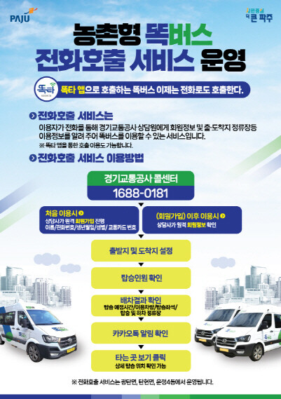 [로컬세계 = 임종환 기자]경기 파주시는 광탄면과 탄현면, 운정4동 일원에서 운행 중인 ‘농촌형 똑버스(DRT)’에 전화호출서비스가 도입된다고 16일 밝혔다.