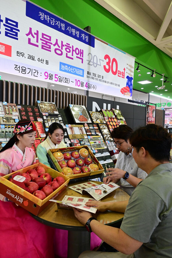 ▲ 12일 서울 서초구 하나로마트 양재점에서 고객들이 선물 세트를 상담하고 있다. |