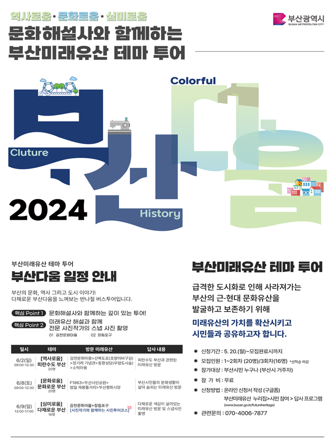 하반기 신청은 8월경에 추가 공지할 예정이다. 기타 자세한 사항은 시(www.busan.go.kr/nbnews) 및 부산미래유산 누리집 공지사항을 참고하면 된다.