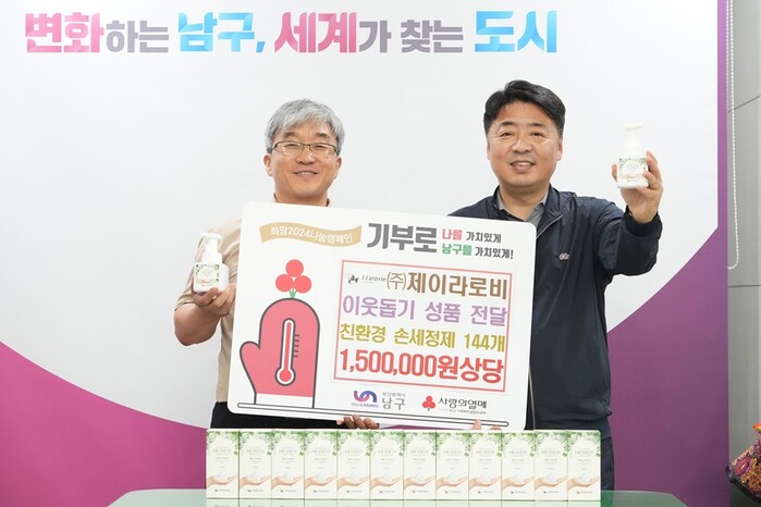 [로컬세계 부산=맹화찬 기자]부산시 남구는 주식회사 제이라로비가 지난 15일 어려운 이웃을 위해 사용해달라며 150만원 상당의 손세정제를 전달했다고 18일 밝혔다.