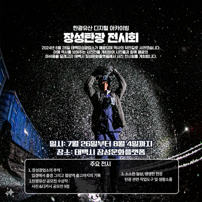 이번 전시회는 폐광지역 관광산업 활성화 3단계 사업인 ‘탄광유산 디지털 아카이빙 구축사업’의 일환으로, 근대산업 발전의 한 축을 이끌어 온 장성광업소와 그 안의 주역들인 광부들의 수집 기록을 사진과 영상으로 관광객 및 시민들에게 선보인다.