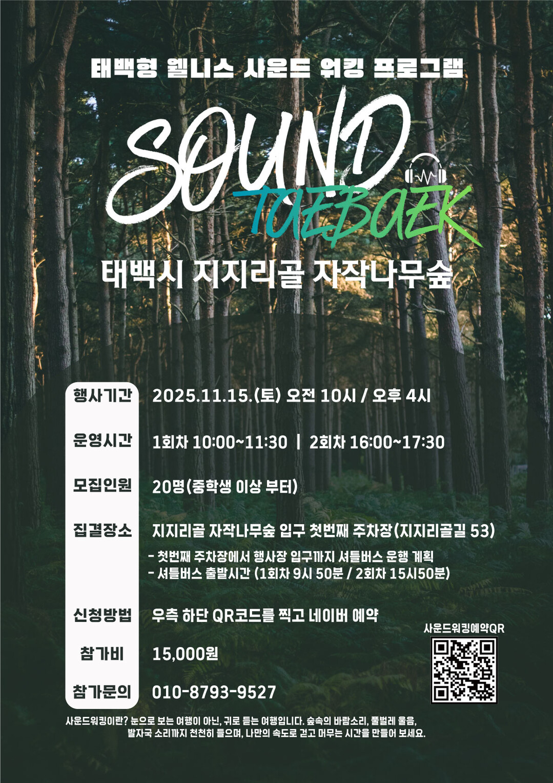 참가자들은 숲과 계곡을 걸으며 새소리·바람소리·물소리·발자국 소리 등 자연의 리듬을 온전히 느끼고, 태백의 역사와 생태, 마을 이야기가 담긴 사운드 콘텐츠를 통해 감각적 치유와 휴식을 경험하게 된다.