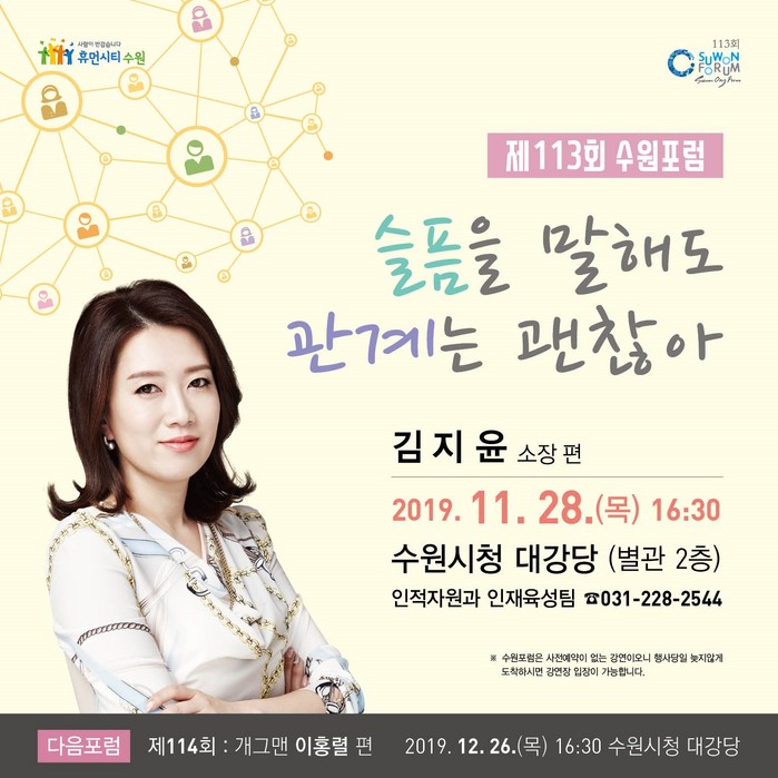 이번 포럼에서 김지윤 소장은 다양한 관계 속에서 생기는 오해와 상처를 지혜롭게 해결하는 방법. 건강하게 소통하는 법 등을 설명한다.