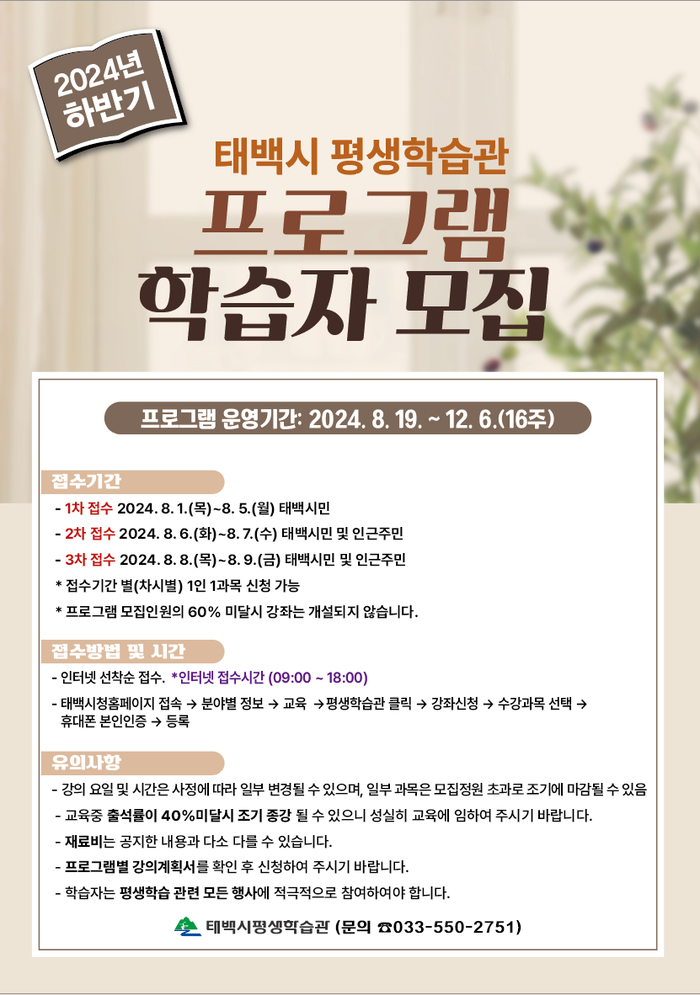 신청은 온라인 접수(태백시청 홈페이지→평생학습관 교육 신청→ 강좌 신청→수강 과목 선택→휴대폰 본인인증 후 교육 신청)로 가능하다.