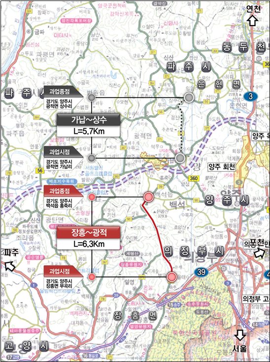 ‘국지도 39호선(장흥~광적) 확·포장공사’는 총 사업비 914억원을 투입해 양주시 장흥면 부곡리에서 백석읍 홍죽리까지 6.3km 구간을 왕복 2차로로 개량하는 사업이다.