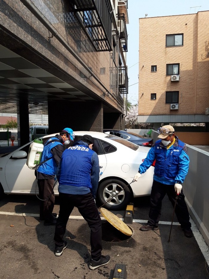 | ▲권선구보건소 방역소독팀이 개인 하수시설을 방역하고 있다.(수원시 제공) |