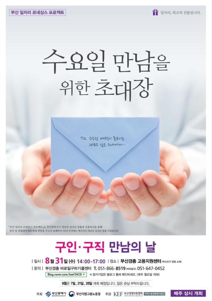 시 관계자는 “‘구인·구직 만남의날’ 을 통해 부산 지역 중소기업의 구인 수요가 발생하는 시기에 훈련생들의 수료일을 맞추고 상시적인 취업알선의 장을 마련하여 적시적인 취업지원 및 기업의 인력난을 해소하여 청년층 실업률 해소에 기여할 것”이라고 말했다