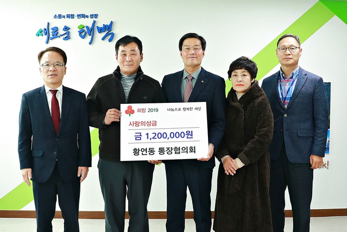 강원 태백시 황연동통장협의회(회장 전호규)가 지난 5일 ‘희망2020나눔 캠페인’ 태백시 모금에 동참했다. 협의회는 회원들이 십시일반 모은 성금 120만원을 이웃돕기 성금으로 쾌척하며, 이웃 사랑을 실천해 주위를 훈훈하게 하고 있다.(사진=태백시 제공)