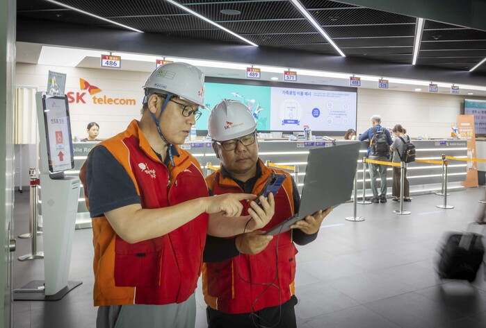 ▲ 사진은 SKT와 SK오앤에스 구성원이 인천국제공항에서 통신 상태를 점검하는 모습.(SKT 제공) |