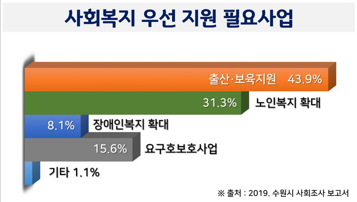 수원시가 지난해 8~9월 1590가구를 대상으로 한 ‘2019 수원시 사회조사’ 결과에 따르면, 응답자의 43.9%가 ‘사회복지 우선 지원 분야’로 ‘출산·보육 지원’을 택했다.