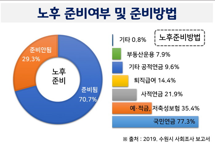 응답자 10명 중 7명은 노후를 준비했거나 준비하고 있는 것으로 나타났다. 70.7%가 “노후를 준비했다(하고 있다)”고 했다. “노후를 준비하고 있지 않다”는 응답 비율은 2015년 36.1%, 2017년 34.5%, 2019년 29.3%로 줄어드는 추세다.