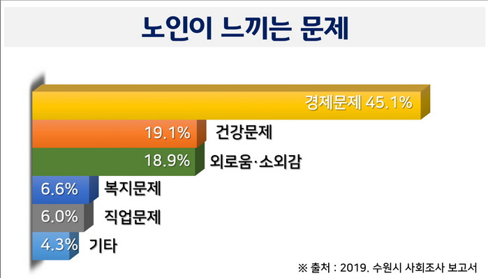 ‘노인들이 느끼는 가장 심각한 문제’를 묻자 ‘경제 문제’라는 답이 45.1%로 가장 많았다. ‘건강 문제’가 19.1%, ‘외로움, 소외감’이 18.9%였다.