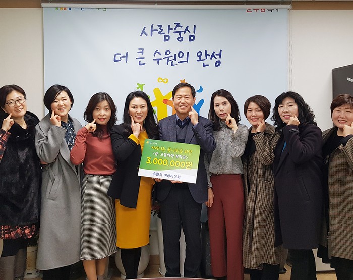경기 수원시여성리더회가 저소득층 가정의 중·고등학생들을 위해 써달라며 수원시에 장학금 300만원을 전달했다. 전달식은 11일 시청 복지여성국장 집무실에서 열렸다.