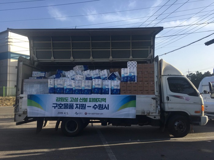 발생 이튿날인 5일 고성 산불 현장대책본부(고성군 토성면사무소)를 방문한 수원시 대표단은 이재민에게 지원할 1000만원 상당의 구호 물품(치약·샴푸·물티슈·휴지·수건 등)을 전달했다.