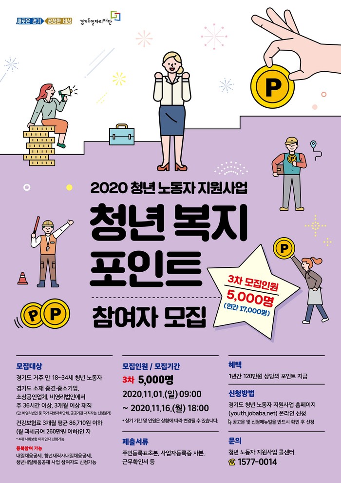 [로컬세계 고기훈 기자]경기도일자리재단이 청년 노동자들의 처우 개선과 복리후생 지원을 위한 ‘청년 복지포인트’ 3차 참여자 5000명을 공개 오는 16일까지 모집한다고 1일 밝혔다.
