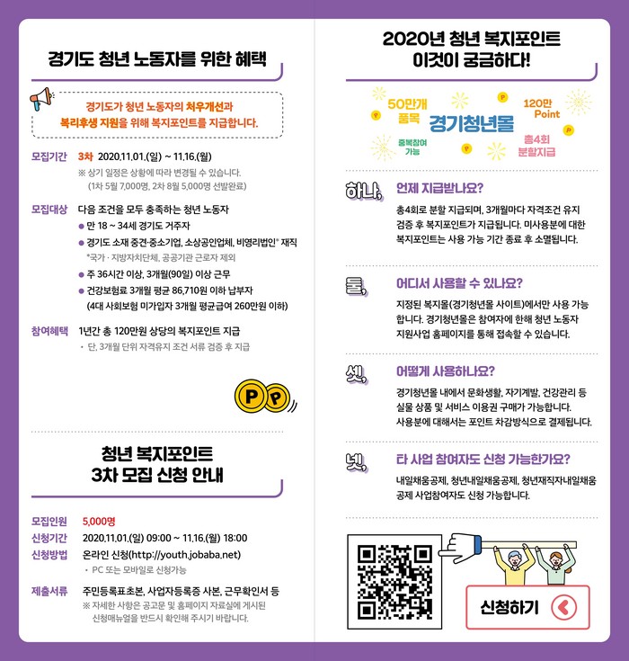 청년 복지포인트 사업은 경기도에 거주하는 만 18∼34세 청년 중 도내 중소·중견 기업, 소상공인업체, 비영리법인에서 주 36시간 이상 근무하는 월 급여 260만원 이하 재직자에게 연간 120만원 상당의 복지포인트를 지원하는 사업이다.