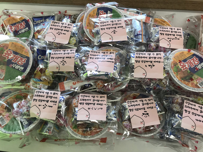 정성껏 포장한 간식 꾸러미에는 컵라면, 과자, 사탕, 음료수 등이 들어있었다. “건강하게 나을 수 있게 도와주셔서 감사합니다. 항상 건강하시길 바라요”라는 글이 적힌 쪽지도 붙어있었다. 이씨는 간식 꾸러미 30개를 근무자에게 전달했다.