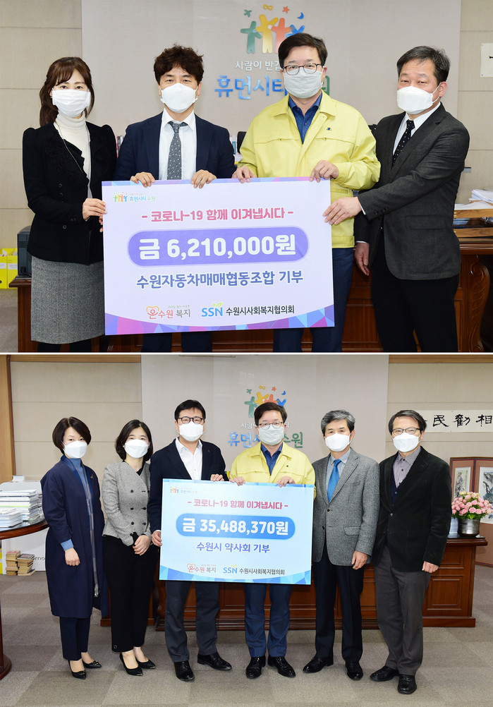 | ▲수원시 약사회(아래), 수원자동차매매협동조합(위) 성금 전달(9일). |