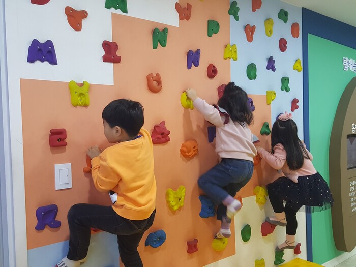▲ 암벽 등반 신체활동을 체험하는 어린이들. 관악구 제공 |