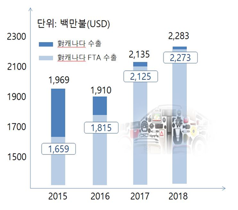 자동차와 자동차 부분품의 수출은 캐나다 수출 전체의 40.1%를 차지한다. FTA 발효로 우리나라 수출 승용차에 부과되는 관세는 지속적으로 줄어들다 2017년 완전 철폐됐다. 이에 자동차와 자동차 부품의 수출은 꾸준히 오르는 추세다.