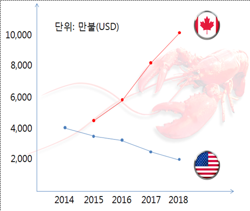 | ▲랍스터 수입 추이 미국산 vs 캐나다산. |