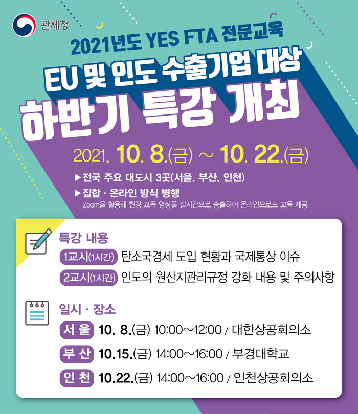 관세청(청장 임재현)은 상반기 역내포괄적경제동반자협정(RCEP) 활용 전략 특강에 이어 10월 8일 서울을 시작으로 15일 부산, 22일 인천에서 탄소국경세와 인도의 원산지관리 강화를 주제로 하반기 특강을 개최한다고 30일 밝혔다.
