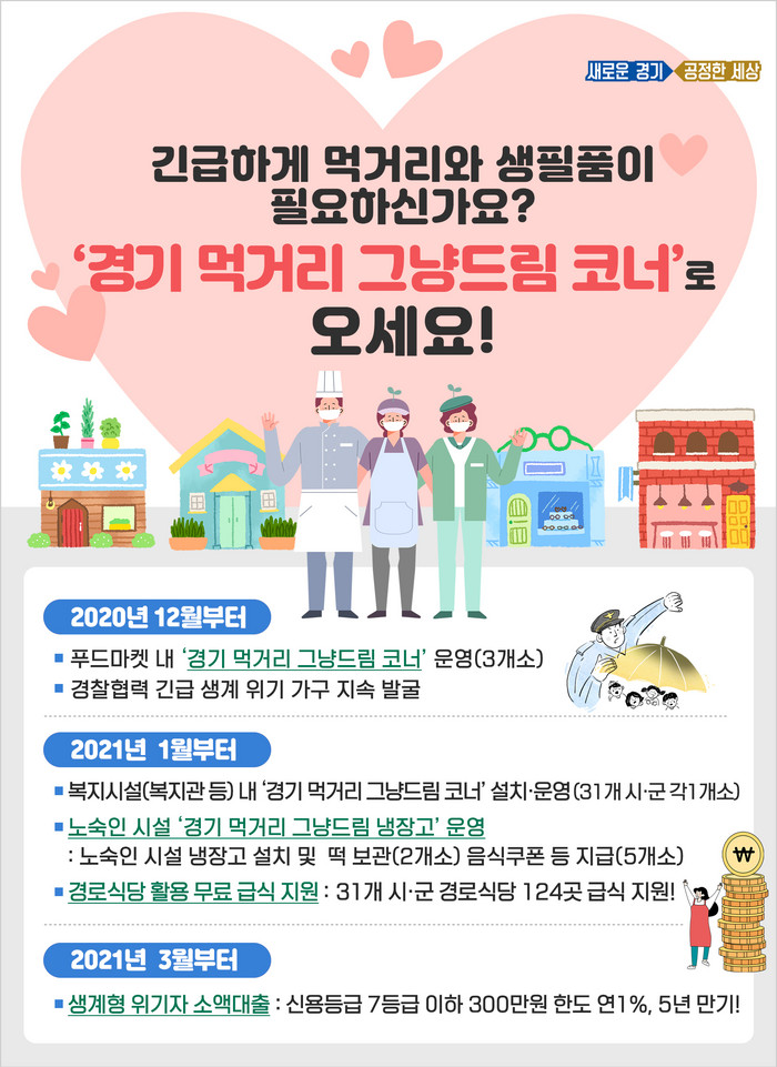 내년 1월에는 31개 시·군별로 종합, 장애인, 노인복지관 등 복지시설 중 1곳씩을 선정해 ‘경기 먹거리 그냥드림 코너’를 설치·운영한다. 긴급 생계위기 대상자 등 생활에 어려움을 겪고 있는 사람은 누구나 이곳에서 무료로 먹거리와 생활용품을 이용할 수 있다.