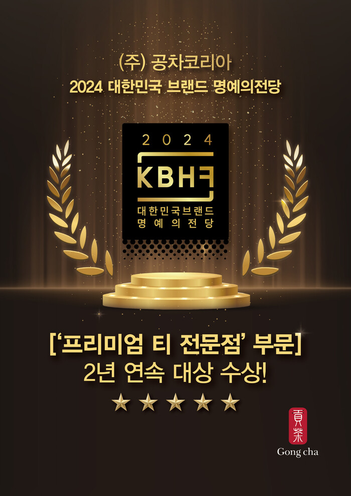 ▲ 공차코리아, 2024 대한민국 브랜드 명예의전당 ‘프리미엄 티 전문점’ 부문 2년 연속 수상. |