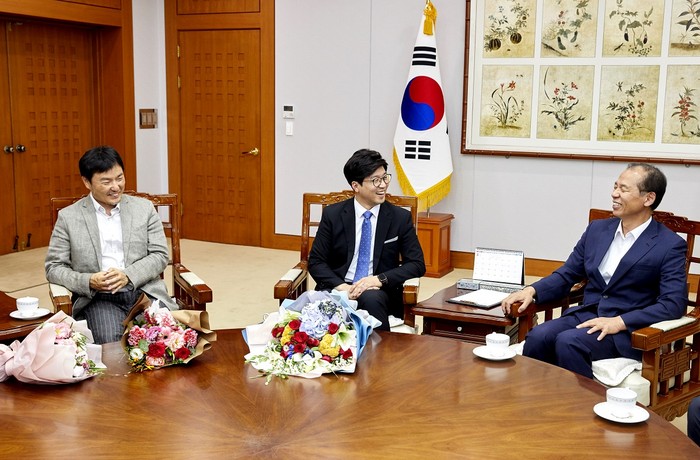 | ▲7일 강원도 춘천시 강원도청에서 열린 ‘강원 산불 피해지역 복구 지원 기부금 전달식’에서 뉴스킨 코리아 조지훈 대표이사(왼쪽에서 두 번째), 뉴스킨 코리아 포스 포 굿 위원회 조규철 상임위원(왼쪽에서 첫 번째), 강원도청 최문순 도지사(오른쪽에서 첫 번째)가 대화하고 있다. |