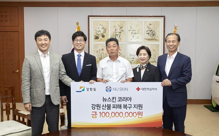 [로컬세계 길도원 기자]뉴스킨 코리아는 지난 7일 강원도 춘천시 강원도청에서 ‘강원 산불 피해 지역 복구 지원 프로젝트’의 기부금 전달식을 개최하고, 후원금 1억원을 기부했다.