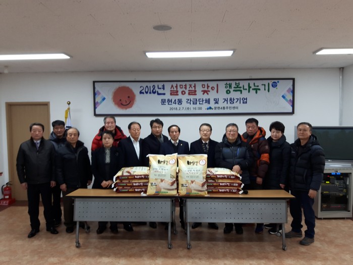 [로컬세계 맹화찬 기자]부산시 남구 문현4동 주민자치위원회(위원장 이산하)와 문현4동 주민센터(동장 김희숙) 은 8일 주민자치위원회와 거창기업, 각급 단체 후원으로 '설명절 맞이 행복 나누기' 행사를 가졌다.
