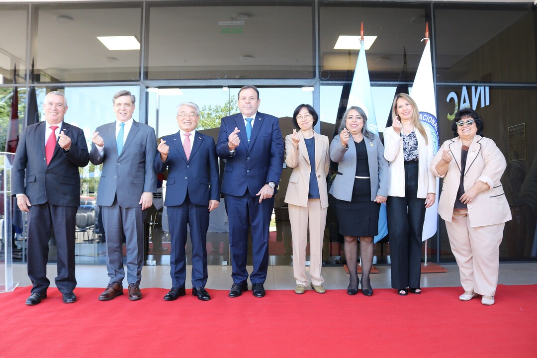 코이카가 20일(현지시간) 파라과이 수도 아순시온 근교 루케시에 위치한 국립항공훈련원(INAC‧Instituto Nacional de Aeronautica Civil)에서 개최한 ‘파라과이 항공 전문인력 역량강화사업’ 종료식에서 주요 참석자들이 기념사진을 촬영하고 있다. (왼쪽 두번째부터 마르코 알카라즈 국가정보원장, 홍석화 코이카 이사, 넬슨 멘도사 국립민간항공청장, 허주희 한국공항공사 본부장, 에스텔라 마르티네즈 국립항공훈련원장) 코이카 제공