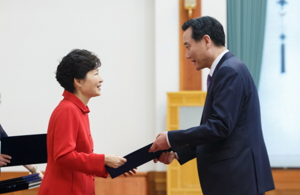 ▲ 박근혜 대통령이 지난 9일 오후 청와대에서 김현웅 신임 법무부장관에게 임명장을 수여하고 있다. <사진출처=청와대 홈페이지> |