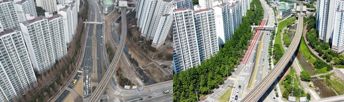 ▲ 구갈교사거리 기흥역방면 우회전차로 추가 공사 전·후 모습. 용인시 제공 |