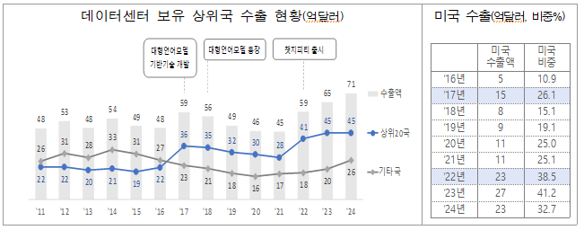 AI 기술 기반을 마련한 2017년 구글의 트랜스포머 발표와 2018년 대형언어모델 등장 이후 전력기기 수출은 본격적인 성장 흐름을 탔다. 여기에 2022년 챗지피티 등장으로 초대형 데이터센터 구축이 필수화되면서 한국 전력기기의 수출 곡선도 한 단계 더 가파르게 상승했다. 실제로 미국, 영국, 독일, 중국, 프랑스 등 데이터센터 보유 상위 20개국으로의 수출이 크게 늘었으며 특히 기술을 선도하고 시설 보유 수가 압도적인 미국이 성장을 주도하고 있다.