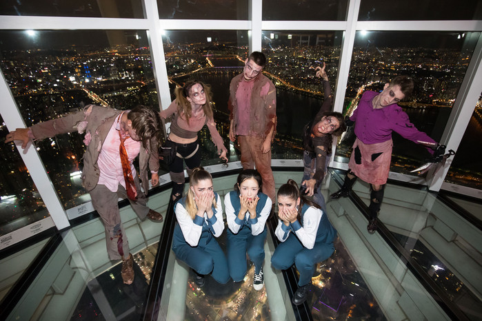 6일, 서울 송파구 롯데월드타워 전망대 서울스카이(대표 박동기)를 찾은 시민들이 118층 ‘스카이데크’에서 펼쳐진 ‘할로윈 좀비 플래쉬몹’ 공연을 관람하고 있다.