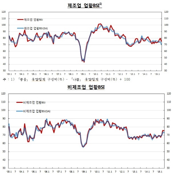 한국은행이 오늘(29일) 발표한 ‘2015년 5월 기업경기실사지수(BSI) 및 경제심리지수(ESI)’에 따르면 지난 14일에서 21일까지를 기준으로 한 제조업의 5월 업황BSI는 75로 전월에 비해 5포인드가 하락했으며 6월 업황전망BSI 역시 77로 전월에 비해 5포인트가 하락했다.