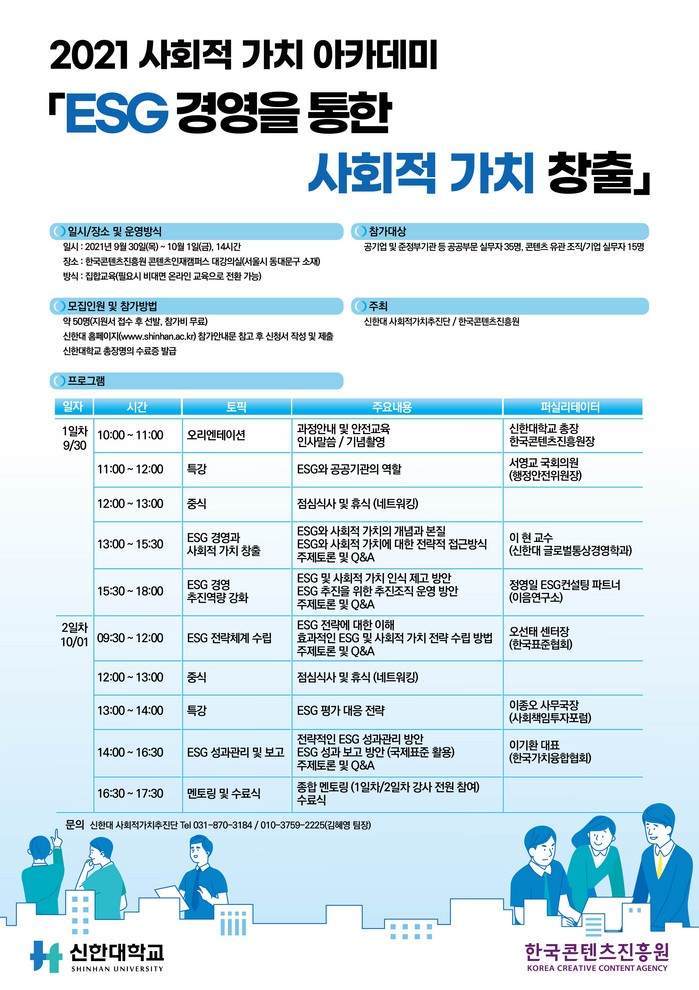 한국콘텐츠진흥원과 신한대학교는 ‘2021 사회적 가치 아카데미 ’(이하 2021 사회적 가치 아카데미)를 오는 9월 30일과 10월 1일 양일간 운영한다.