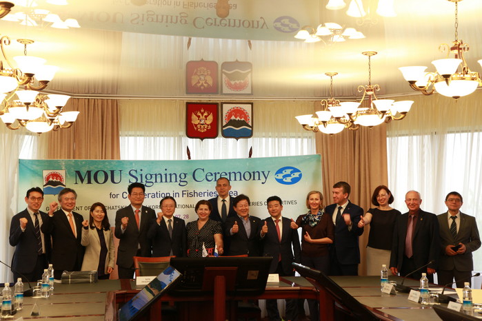 | ▲지난 29일(현지시간) 수협중앙회와 캄차카 주정부 관계자들이 수산분야 협력을 위한 양해각서(MOU)를 체결하고 기념촬영을 하고 있다. |