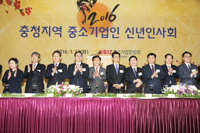 이날 중소기업인 신년인사회를 축하해주기 위해 지자체장으로 권선택 대전시장, 이춘희 세종시장, 이시종 충북도지사, 송석두 충남도 행정부지사, 이승훈 청주시장이 참석했다.