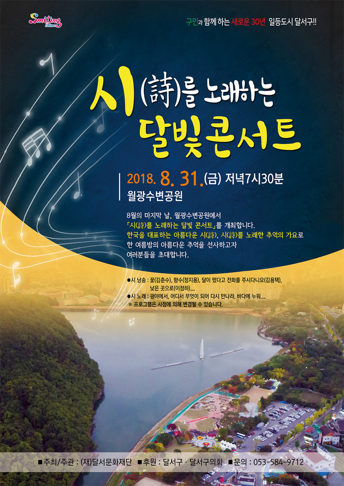 [로컬세계 박세환 기자]대구 달서문화재단은 31일 월광수변공원에서 ‘시를 노래하는 달빛 콘서트’를 열며 은은한 달빛 아래 여름 저녁의 낭만을 만끽하게 해준다.