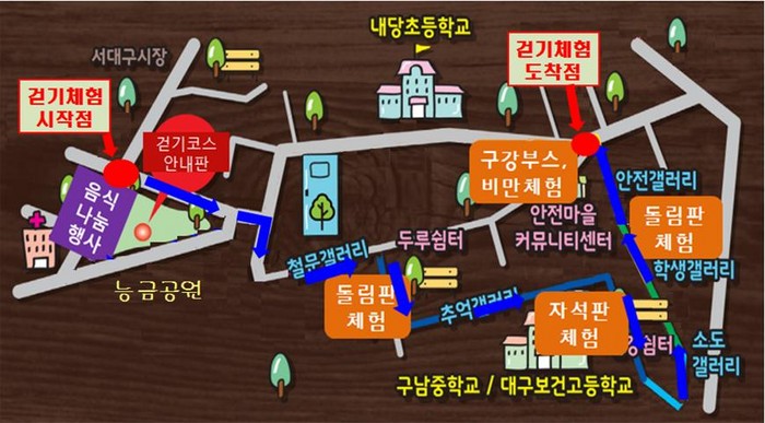 행사는 두류동 능금공원 인근에서 출발해 구남중학교를 거쳐 안전마을 커뮤니티센터까지 900미터를 걷는다. 지나가는 골목길에는 벽화로 꾸며진 철문, 추억, 안전갤러리 등이 있다.