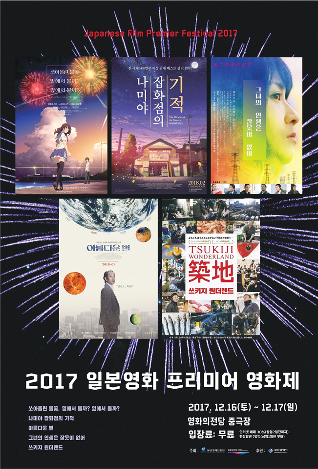 부산경제진흥원과 영화의전당이 공동 주최하는 ‘2017 일본영화 프리미어 영화제’ 관람료는 모두 무료(인터넷 사전 예매 30%-상영 2일 전까지, 현장 70%-상영 1일 전 및 당일 발권)로 관람객 대상 경품 증정 이벤트도 실시된다.