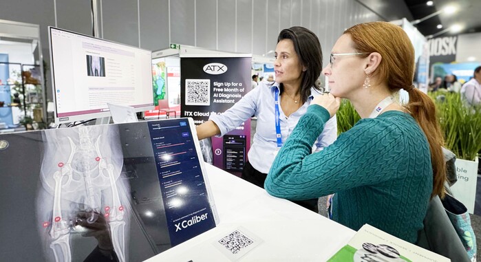 ▲ ‘엑스칼리버’의 호주 시장 유통 파트너사인 ATX의 다이아나 로이스 매니저(사진 왼쪽)가 28일 호주 최대 수의학회 행사인 AVA 컨퍼런스에서 참가 수의사에게 ‘엑스칼리버’를 소개하는 모습. |
