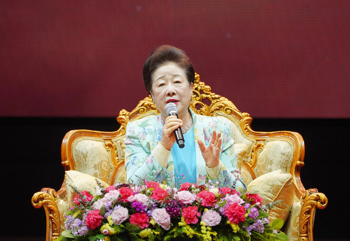 ▲27일 세계 120개국의 미혼 청년 10만 명이 동참하는 가운데 개최된 ‘효정축복축제’에서 한학자 세계평화통일가정연합 총재가 연설을 하고 있다.(사진=세계평화통일가정연합) |