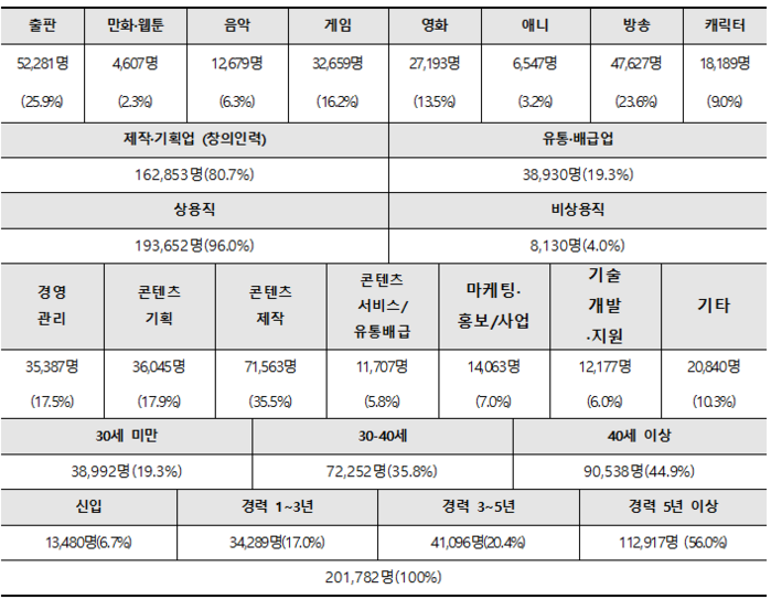 보고서에 따르면 2021년 기준 8개 장르 콘텐츠산업 제작·유통 인력은 총 28.1만 명(단순 임대 및 도소매업 종사자 제외)이며, ▲사업체 종사자(정규/비정규직) 20.2만 명(71.9%) ▲프리랜서 7.9만 명(28.1%)으로 추산된다.