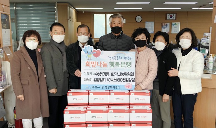 [로컬세계 박세환 기자]대구 수성구 수성4가동 희망나눔위원회(위원장 정정호)는 지난 3일 수성4가동 행정복지센터를 방문해 어려운 이웃에게 전달해 달라며 김장김치 40박스(80만원 상당)를 기탁했다.